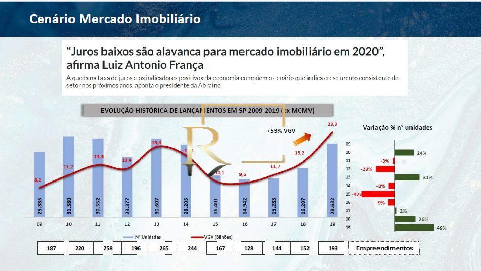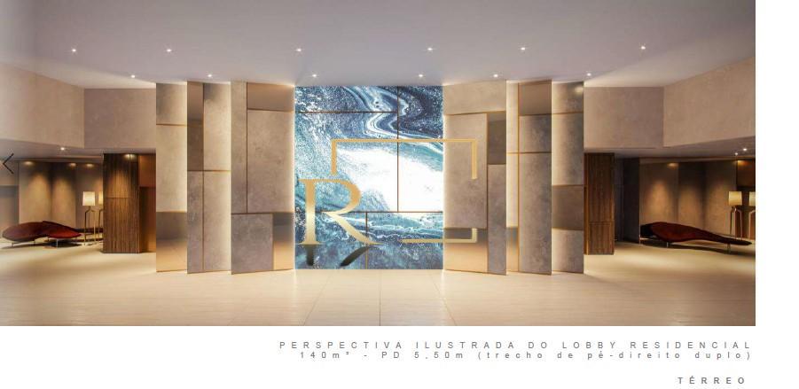 Lobby residencial com 140 m² e pé-direito duplo de 5,5m .