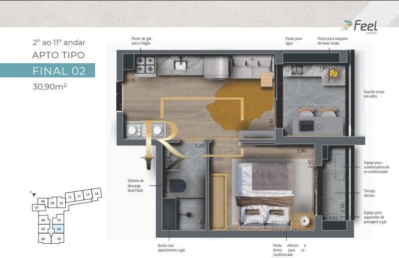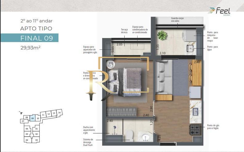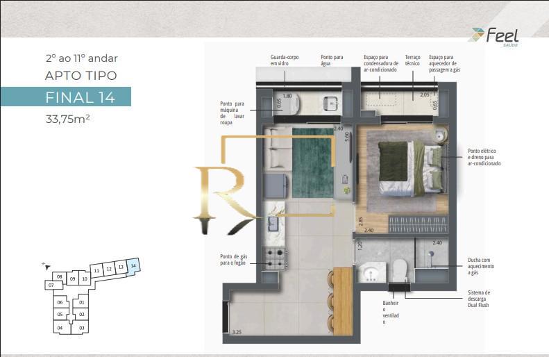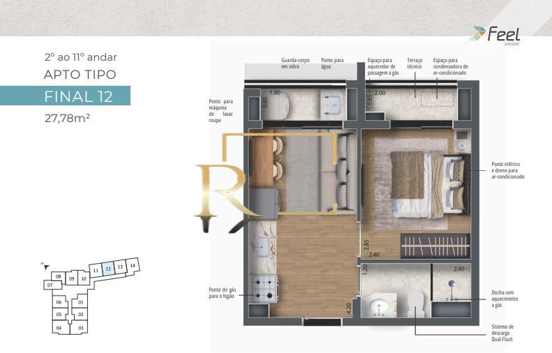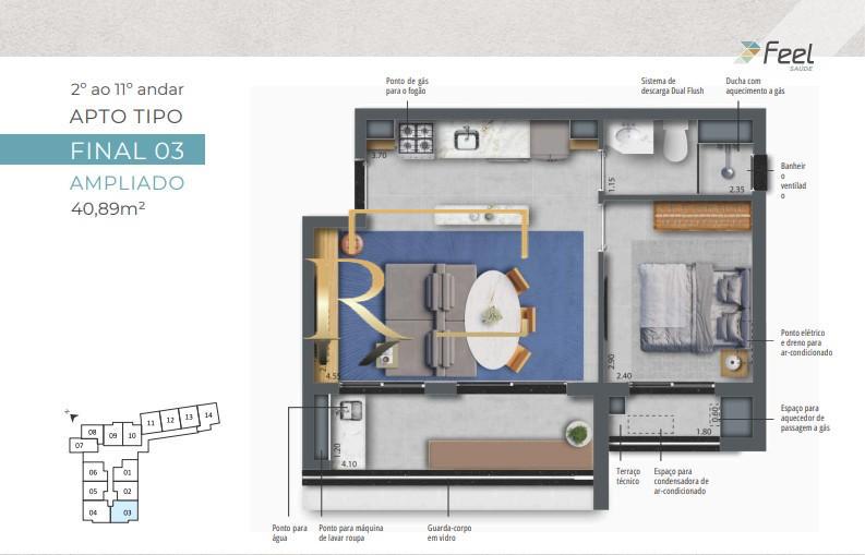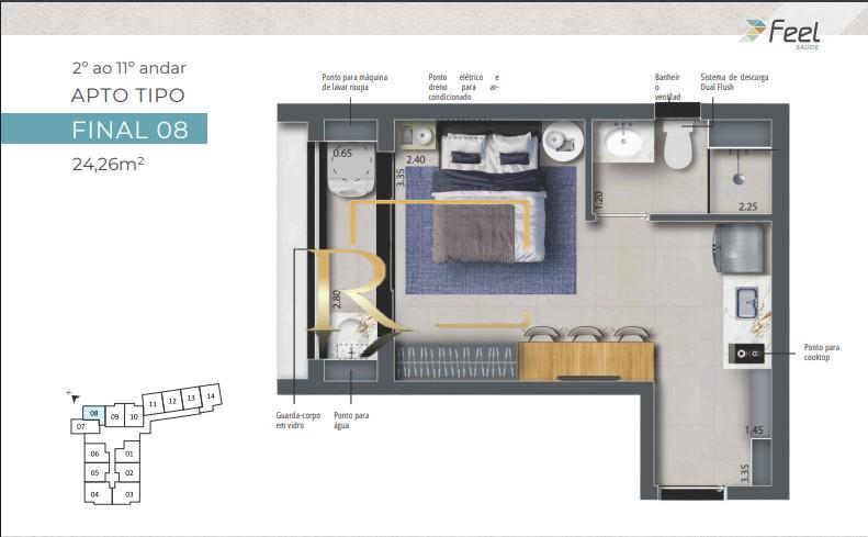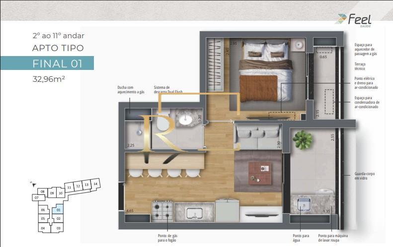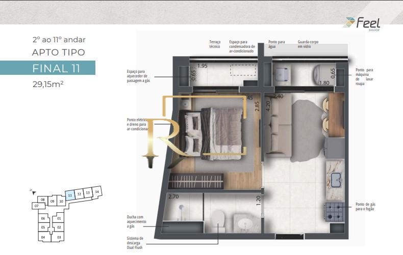 O Feel Saúde oferece uma variedade de plantas inteligentes distribuídas do 2º ao 11º andar, com metragens que se adaptam ao seu estilo de vida. São opções que vão de 24 m² a 64 m², entre studios e apartamentos de 1 ou 2 dormitórios, todas com layouts modernos, excelente aproveitamento de espaço, guarda-corpo em vidro e infraestrutura completa para ar-condicionado, aquecimento a gás e muito mais.